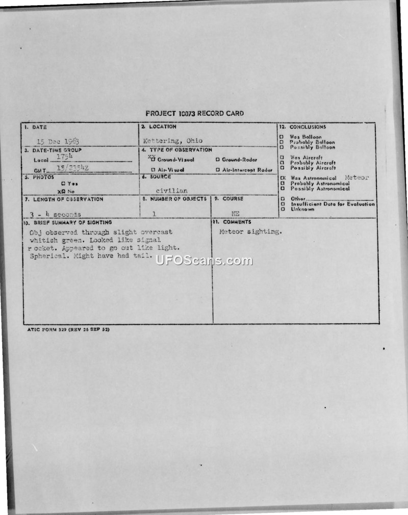 This document is a Project 10073 record card detailing a sighting that occurred on December 15, 1963, in Kettering, Ohio. The observation, made by a civilian witness at 1754 local time (2354Z), lasted for approximately 3 to 4 seconds. The witness described the object as a spherical, whitish-green light that resembled a signal rocket and may have had a tail. The object was observed through a slight overcast and was moving in a northeasterly direction. The record card indicates that the observation was visual only, with no radar contact or photographic evidence. The official conclusion recorded on the card is that the event was a meteor sighting.