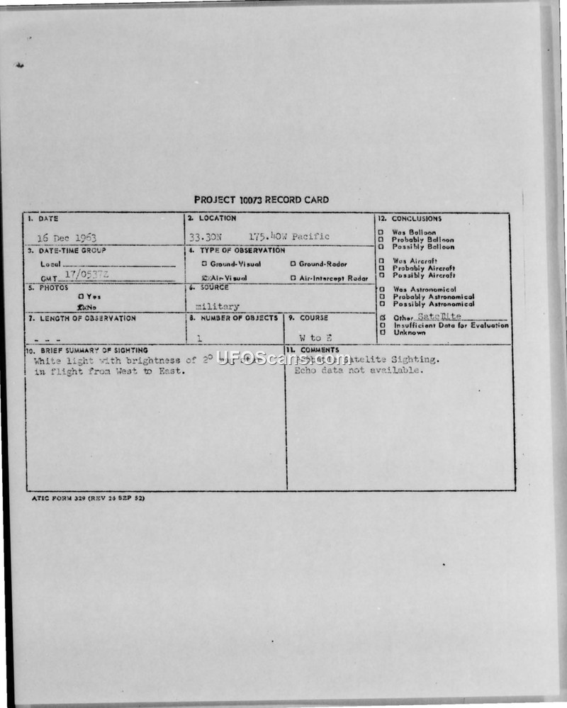A 1963 military report documents a sighting of a white light in the Pacific, which was officially concluded to be a probable satellite. The report was circulated among various US military and intelligence commands.