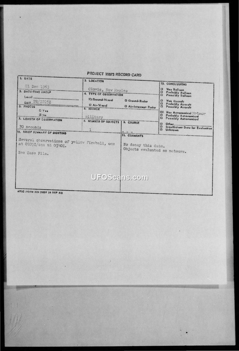 Project 10073 Record Card and Incoming Staff Message Reports — Clovis, New Mexico, December 1963