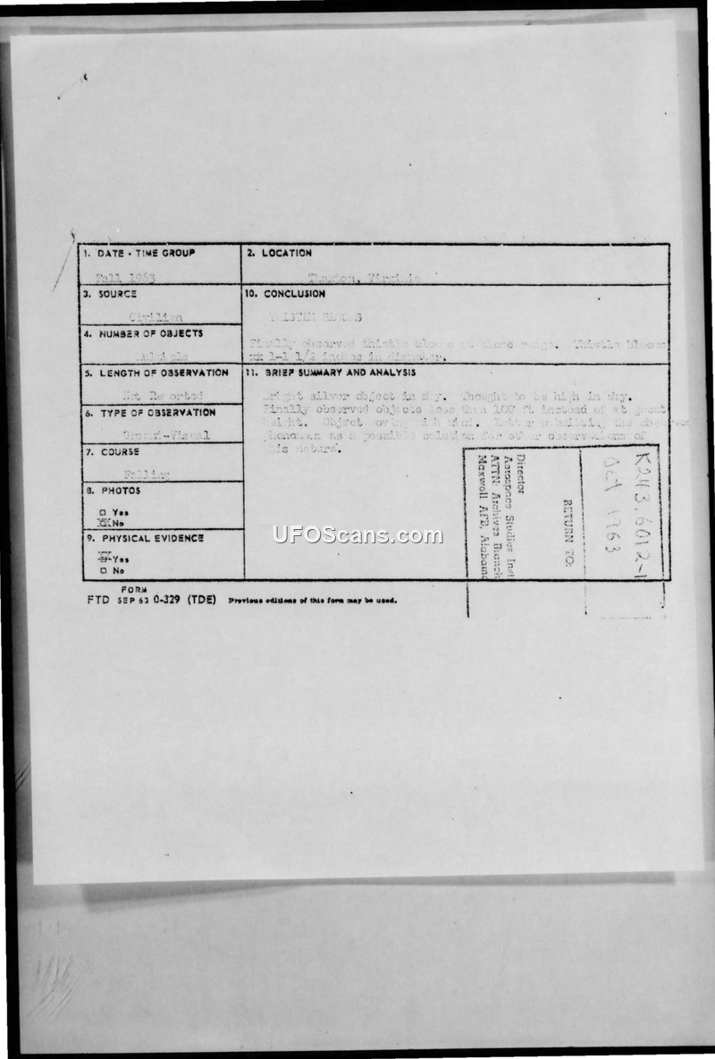 This document collection details a correspondence between a private citizen in Thaxton, Virginia, and the United States Air Force regarding a UFO sighting reported in the fall of 1963. The witness initially reported observing bright, silver, glittering objects in the sky, which induced a feeling of fear and a hypnotic sensation. The witness described the objects as being approximately 100 feet in diameter and 12 feet high. Following the initial report, the witness conducted their own investigation and concluded that the objects were actually thistle blooms caught in cross-winds and air currents, which, when viewed from certain angles in bright sunlight, appeared as large, distant, silvery objects. The witness sent samples of the thistle blooms to the Air Force as evidence to support this conclusion. The Foreign Technology Division of the Air Force responded to the witness, confirming that their observation of floating thistle blooms was an interesting case that fell into the general category of 'angel hair' reports. The Air Force noted that similar observations have been attributed to migrating spider webs, rayon residue from chemical plant filters, and silver halides from cloud seeding operations. The Air Force expressed appreciation for the witness's contribution to the program and commended their ability to objectively re-examine the sighting, noting that it is rare for private citizens to accurately assess the relationship between the size and distance of reported objects. The correspondence includes internal Air Force memoranda, the witness's letters, and the official response from Major Maston M. Jacks.