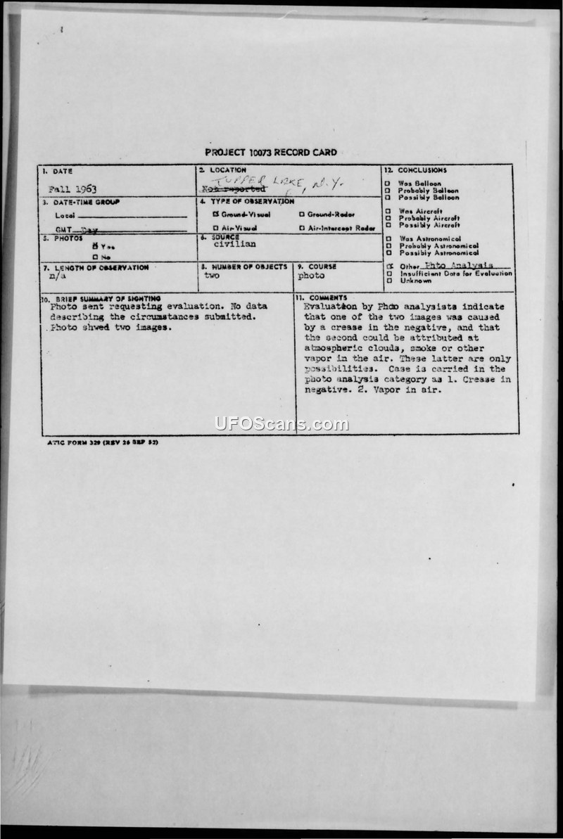 A 1963 photograph from Tupper Lake, NY, showing two images was analyzed by the Air Force. The investigation concluded one image was a negative crease and the other was likely a cloud or vapor, resulting in an 'insufficient data' classification.