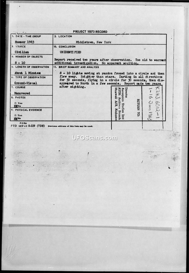 A civilian reported a 1963 sighting of 8-10 unidentified lights in Middletown, New York. The Air Force declined to investigate due to the two-year delay in reporting, though they acknowledged the event was 'very puzzling.'