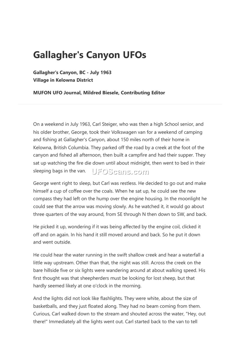 In July 1963, brothers Carl and George Steiger were camping at Gallagher's Canyon, British Columbia, when they experienced a series of unexplained phenomena. While Carl was awake at approximately 1:00 AM, he observed a compass on their Volkswagen van's engine housing moving erratically. Shortly after, he noticed five or six white, basketball-sized lights floating near a creek. When he shouted at them, the lights extinguished. Subsequently, a much larger, bright object appeared, flying above the trees. This object pulsated, shifting between dark and light green, and emitted enough light to illuminate the ground clearly. The object traveled from southwest to northeast, following the canyon, and was observed by both brothers. It eventually moved toward Black Mountain, spiraled around a fire lookout tower, and then accelerated rapidly into the sky. The following morning, the brothers discovered an eight-foot-wide burned ring in the grass near an abandoned log house, with an unburned center and dehydrated, leaning grass. The witnesses did not report the incident to authorities at the time, fearing social stigma, though Carl mentioned it to a science teacher who could not explain the event.