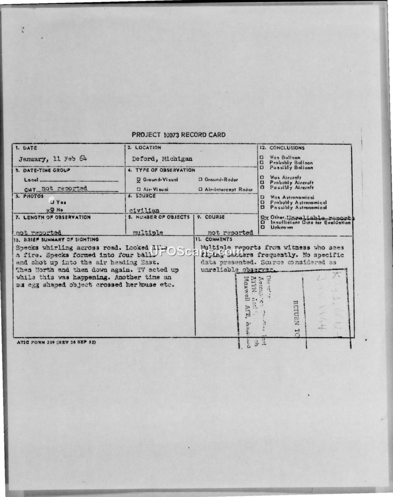 This document consists of a Project 10073 record card and associated correspondence regarding a civilian witness from Deford, Michigan. The record card, dated June 18, 1963, summarizes a sighting from January 1964 (noting a discrepancy in dates) where the witness reported seeing 'specks' that formed into four balls, moved in various directions, and an 'egg shaped object' that crossed her house. The Air Force concluded the report was unreliable, noting that the witness frequently reported flying saucers and provided no specific data. The accompanying correspondence reveals a persistent and frustrated civilian who contacted Senator Pat McNamara to facilitate communication with the Air Force. The witness expresses skepticism regarding the Air Force's explanations, specifically mentioning a 'sonic boom' as an unsatisfactory answer. She also references Major Donald Keyhoe and expresses her belief that the objects are extraterrestrial in origin. The correspondence highlights the tension between the civilian witness and the military's investigative process, with the witness accusing the Air Force of 'burying' reports and being unhelpful.
