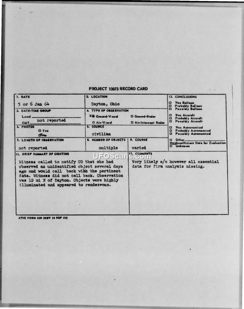 PROJECT 10073 RECORD CARD — Dayton, Ohio, January 1964