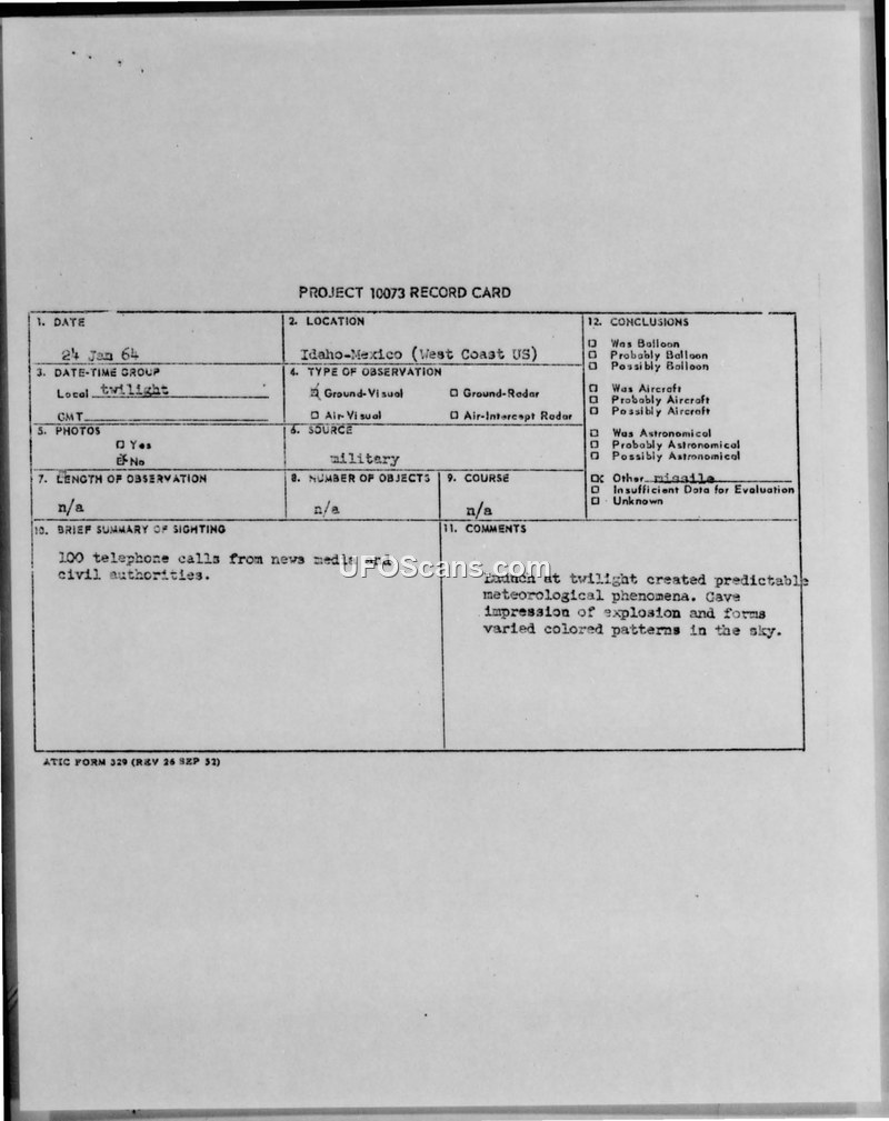 This document consists of a Project 10073 Record Card and an associated incoming Department of the Air Force message regarding a sighting on January 24, 1964. The sighting, which occurred at twilight, was reported by over 100 telephone calls from news media and civil authorities across the region from Idaho to Mexico. The reports described an impression of an explosion and varied colored patterns in the sky. The official investigation determined that the event was a routine Minuteman missile launch from Vandenberg Air Force Base. The Air Force concluded that the visual effects were predictable meteorological phenomena caused by the missile rising from the earth's shadow into sunlight during twilight hours. The document includes a recommendation to add specific language to the DOD Public Affairs Plan 39-A-22 to address future public concerns regarding similar missile launches, explaining that the apparent explosion is a natural phenomenon caused by the density of the atmosphere and the timing of the launch.