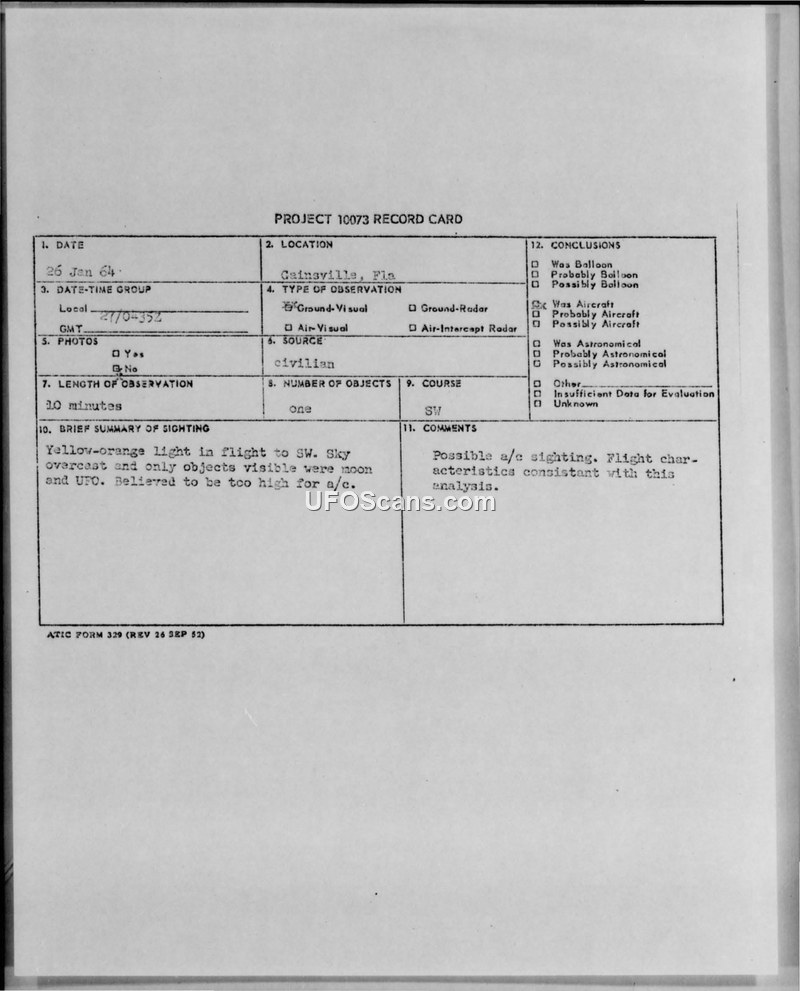 On January 26, 1964, a witness from the University of Florida reported observing a yellow-orange light in the sky while located 70 miles west of Jacksonville, Florida. The witness described the object as traveling on a southwesterly path for approximately ten minutes between 11:25 p.m. and 11:35 p.m. The witness noted that the sky was overcast and that the object and the moon were the only visible items. The witness believed the object was too high to be a conventional aircraft and suggested it might be a space vehicle, satellite, or rocket. The Foreign Technology Division of the Air Force Systems Command reviewed the report. They concluded that while the object's southwesterly trajectory ruled out known satellites, the duration of the sighting was not inconsistent with a high-altitude aircraft. Although they noted there were no regular high-altitude air routes over Gainesville heading southwest, they maintained that an aircraft remained the most likely explanation for the sighting. Major Maston M. Jacks of the Air Force Public Information Division communicated this conclusion to the witness in a letter dated February 20, 1964, and enclosed a brochure regarding the Air Force's program on Unidentified Flying Objects.