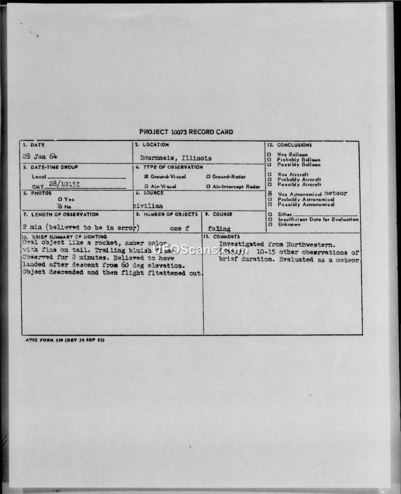 Project 10073 Record Card and Correspondence — Bournnais, Illinois, 28 Jan 64