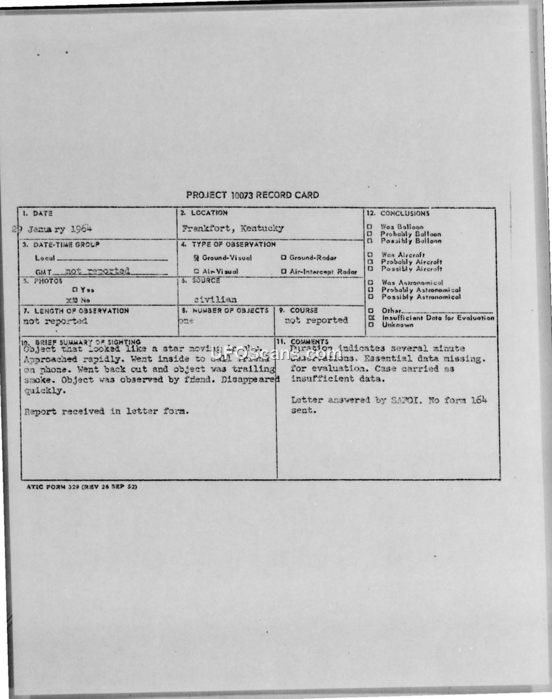 A civilian reported a star-like object trailing smoke in Frankfort, Kentucky, on January 29, 1964. The Air Force closed the case as having insufficient data for evaluation.