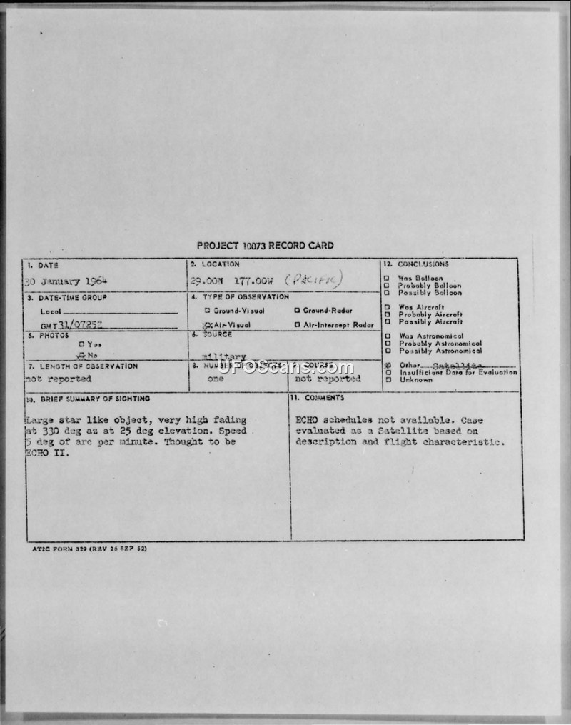 This document collection contains records related to a sighting on 30 January 1964, in the Pacific region at coordinates 29.00N 177.00W. The incident involved a single, large, star-like object observed at 0725Z. The object exhibited a very high fading characteristic and moved at a speed of 5 degrees of arc per minute at an elevation of 25 degrees and an azimuth of 330 degrees. The official evaluation by ATIC concluded that the object was a satellite, specifically noting it was thought to be ECHO II, although ECHO schedules were not available for confirmation. The collection also includes a list of sightings from February 1964, which categorizes various reports as meteors, satellites, aircraft, or insufficient data. Additionally, the document includes an A.P.R.O. Bulletin article from July 1964 detailing a separate sighting in Arkansas, where a witness observed an object with a corkscrew motion, later identified as a UFO by the observer, though the report highlights the involvement of an amateur astronomer. The correspondence included in the file discusses personal observations of objects passing in front of the moon, with one correspondent noting the observation of two objects.