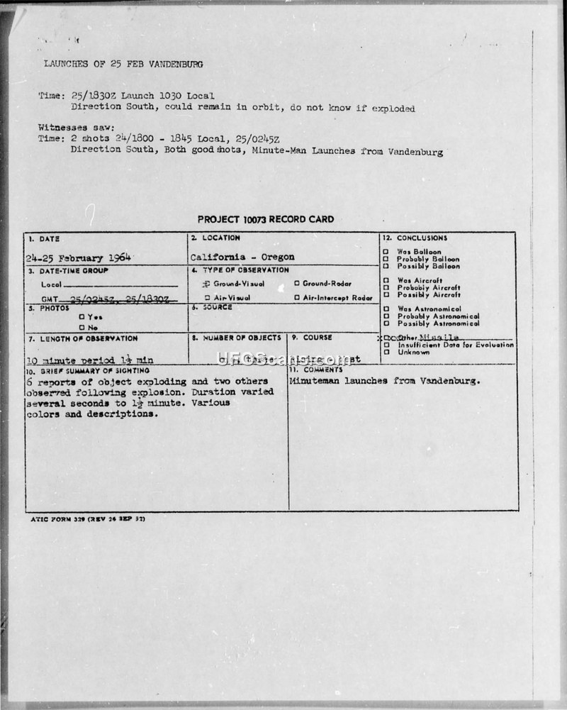 Multiple witnesses in California and Oregon reported sightings of an object that appeared to explode on February 25, 1964. Intelligence officers noted the reports occurred within minutes of similar sightings, and the documents suggest a possible link to Minuteman missile launches from Vandenberg Air Force Base.