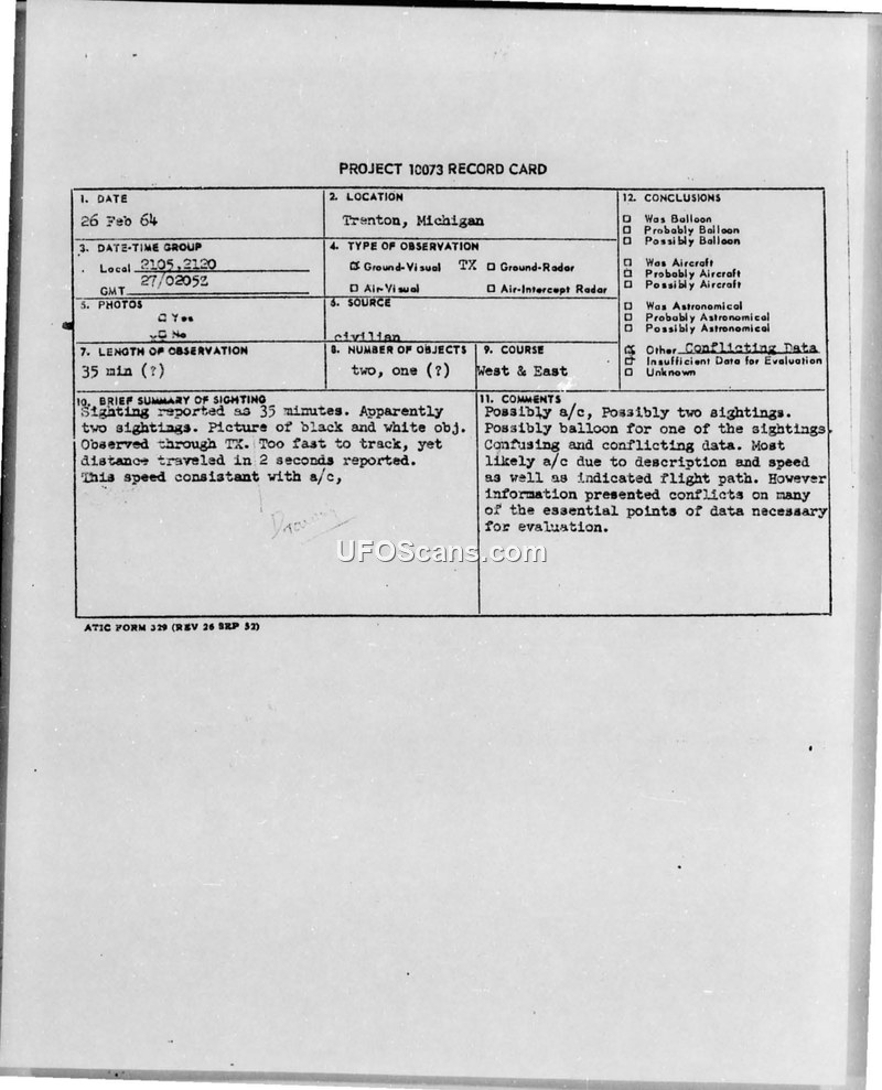 A 14-year-old amateur astronomer reported a high-speed, maneuvering object in Trenton, Michigan, on February 26, 1964. The Air Force investigation concluded the data was too conflicting to reach a definitive explanation.