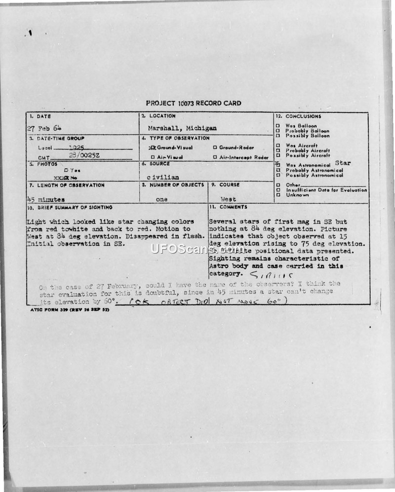 Project 10073 Record Card — Marshall, Michigan, 27 Feb 64