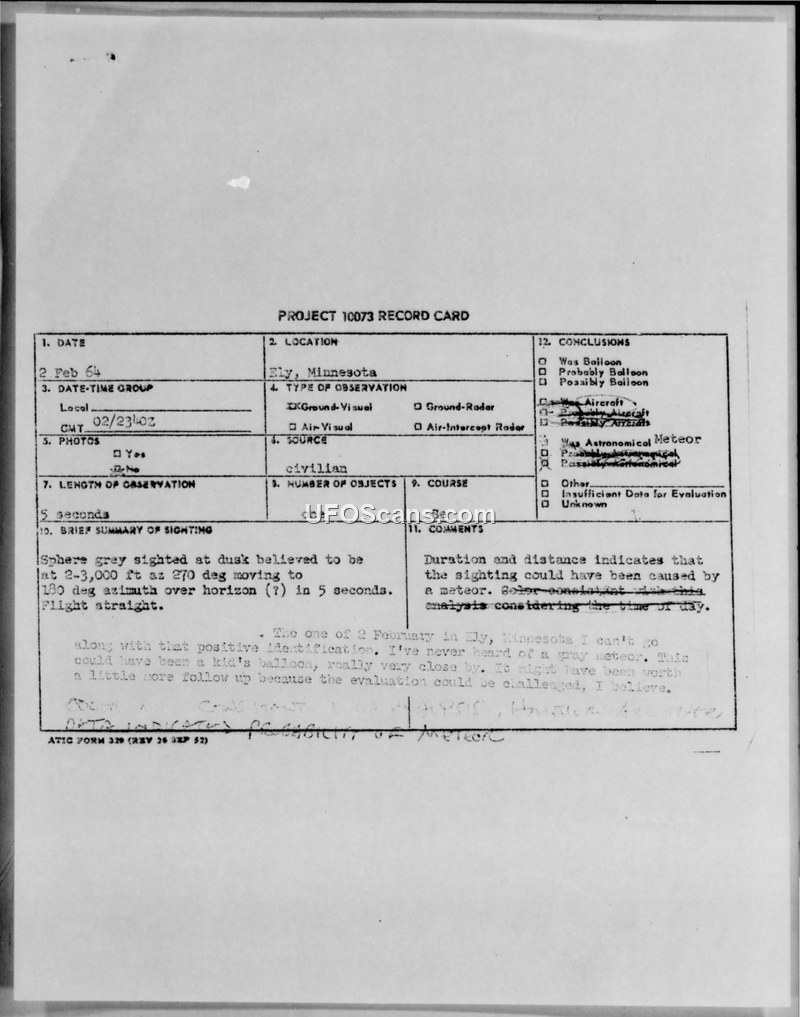 This document consists of a Project 10073 record card and an associated incoming Air Force message regarding a UFO sighting that occurred on 2 February 1964, near Ely, Minnesota. The witness, identified as a former USAF member residing in Hibbing, Minnesota, reported observing a single spherical object at dusk. The object was described as being light transparent or gray, appearing sometimes transparent and sometimes solid. The witness noted that the air around the object appeared to be compressed, making the airflow visible around and behind it. The object was observed at an altitude of 2,000 to 3,000 feet, moving in a straight line from west to south over a period of approximately five seconds before vanishing. Weather conditions at the time were reported as clear and calm. The official conclusion recorded on the card suggests the object could have been a meteor. However, the investigator's notes explicitly challenge this, stating that they have never heard of a gray meteor and suggesting that the object might have been a balloon. The investigator recommended further follow-up, noting that the evaluation could be challenged.