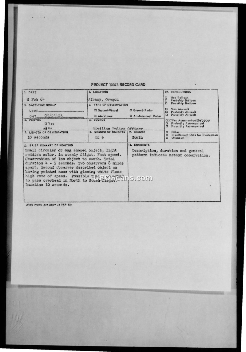 On February 8, 1964, at approximately 0340Z, two separate witnesses in the vicinity of Albany, Oregon, reported observing an unidentified aerial object. The first witness, a 52-year-old maintenance foreman, described a small, circular or egg-shaped object with a light reddish color and a pointed nose, emitting a glowing white flame. He estimated the duration of the sighting to be between 4 and 10 seconds, noting a high rate of speed and a North-to-South flight path. A second witness, a 36-year-old Oregon State Police officer, reported a similar sighting within five minutes of the first, noting the object appeared to resemble a jet interceptor or missile. This second observer reported seeing a ring at the trailing end of the object that obscured the nose section. Both witnesses were approximately eight miles apart. The Air Force investigation, led by Major Arthur F. Shiflett, concluded that the description, duration, and general pattern of the sighting were consistent with a meteor. Despite this official conclusion, the report explicitly notes that the witness was experienced in observing meteors and remained confident that the object was not a meteor.