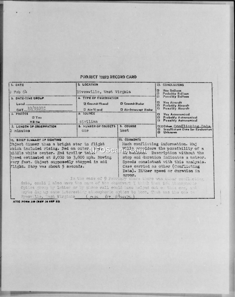 Project 10073 Record Card — Rivesville, West Virginia, 9 February 1964