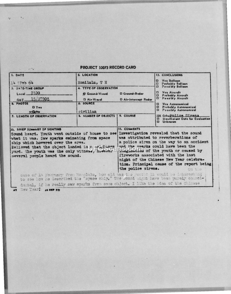 A 1964 UFO sighting in Honolulu was investigated by the Air Force and police. The incident was officially attributed to a combination of police sirens from a nearby traffic accident and Chinese New Year fireworks.