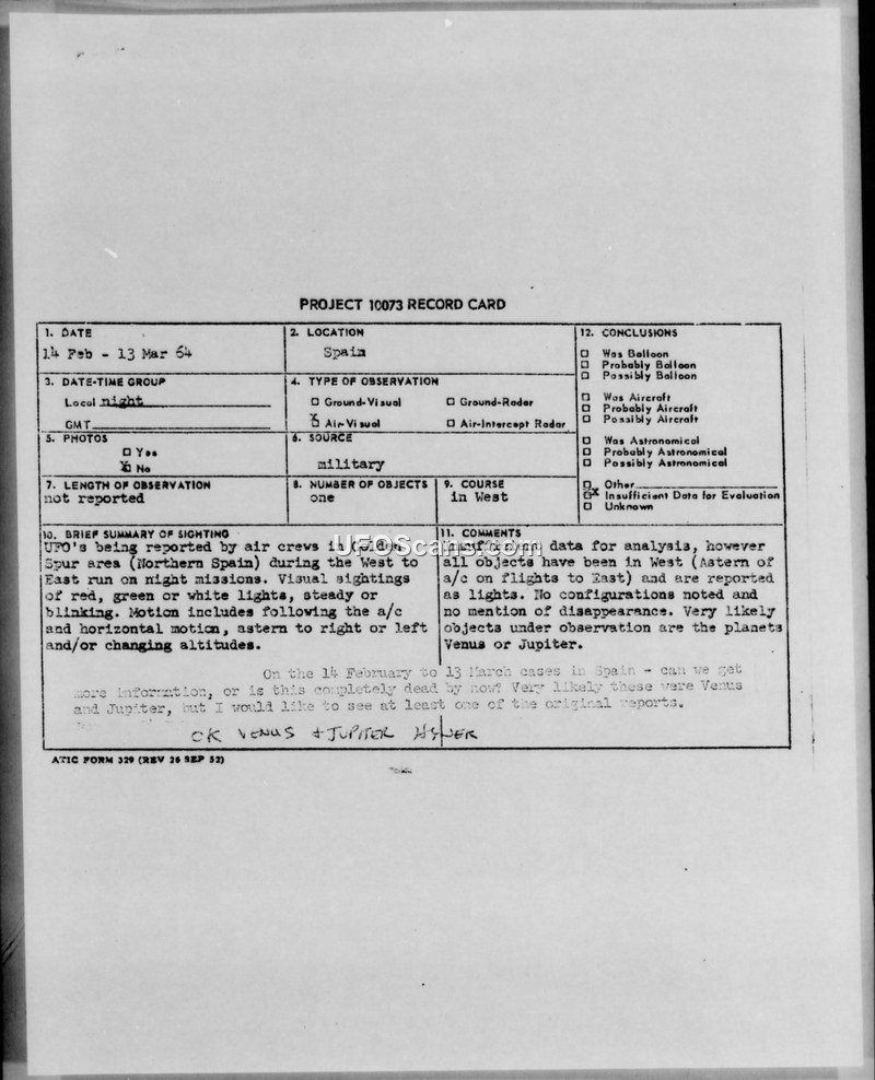 Project 10073 Record Card: Spain Sighting Incident (14 Feb - 13 Mar 64)