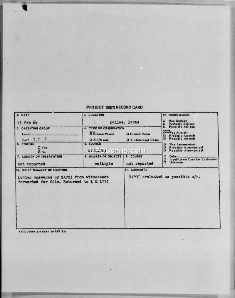 The Air Force investigated a report of multiple aerial objects over Dallas, Texas, in February 1964. They concluded the objects were likely Naval Reserve F-86 aircraft reflecting sunlight.