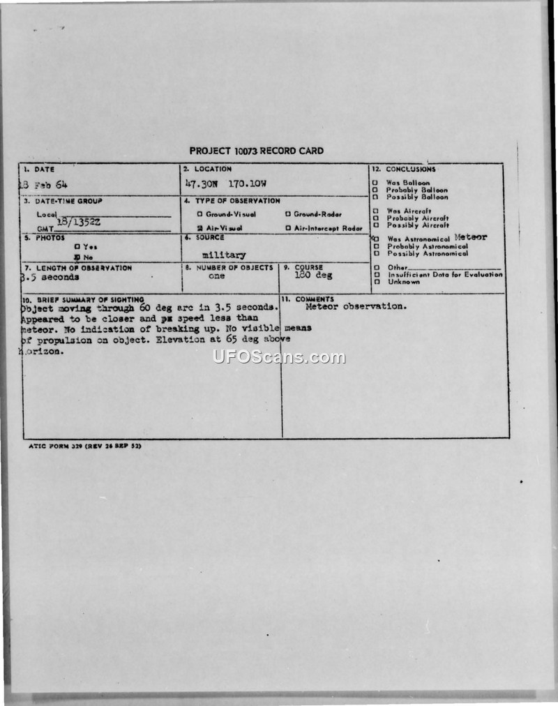 On February 18, 1964, at 1352Z, a military source reported an aerial sighting at coordinates 47.30N 170.10W. The incident was documented as a CIRVIS report (Communication Instructions for Reporting Vital Intelligence Sightings). The witness observed a single, bright object described as being the size of a pin. The object traveled through a 60-degree arc in 3.5 seconds and was positioned at an elevation of 65 degrees above the horizon. The observer noted that the object appeared closer and moved at a speed slower than a typical meteor. There was no indication of the object breaking up, nor were there any visible means of propulsion. The official conclusion recorded on the Project 10073 record card is that the event was a meteor observation. The report was transmitted via military channels to various commands, including PACAF, CINCPAC, and CONCNORAD.