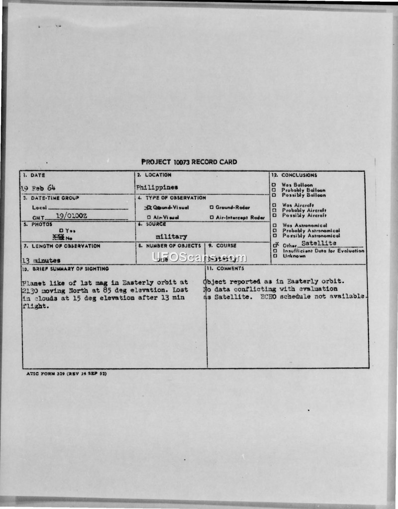 A 1964 sighting of a planet-like object in the Philippines was investigated under Project 10073. The object was officially identified as a satellite.