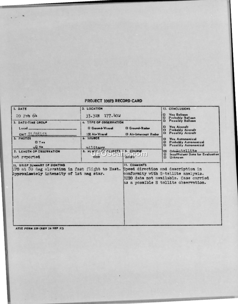 On February 20, 1964, at 210815Z, three observers aboard a Navy EC121K aircraft (Navy 43207) reported a UFO sighting at coordinates 33.30N 177.40W. The object was observed at an 80-degree elevation, moving in an easterly direction at a very high speed. The observers estimated the intensity of the object to be that of a first-magnitude star. The incident was reported via a CIRVIS report under JANAP 146D protocols. The sighting was subsequently documented on a Project 10073 record card. Official evaluation of the event concluded that the object was a possible satellite, noting that the speed, direction, and description were in conformity with satellite analysis. It was further noted that ECHO data was not available for the case. The report was distributed to various military commands, including CINCPAC, CINCNORAD, and the CIA.