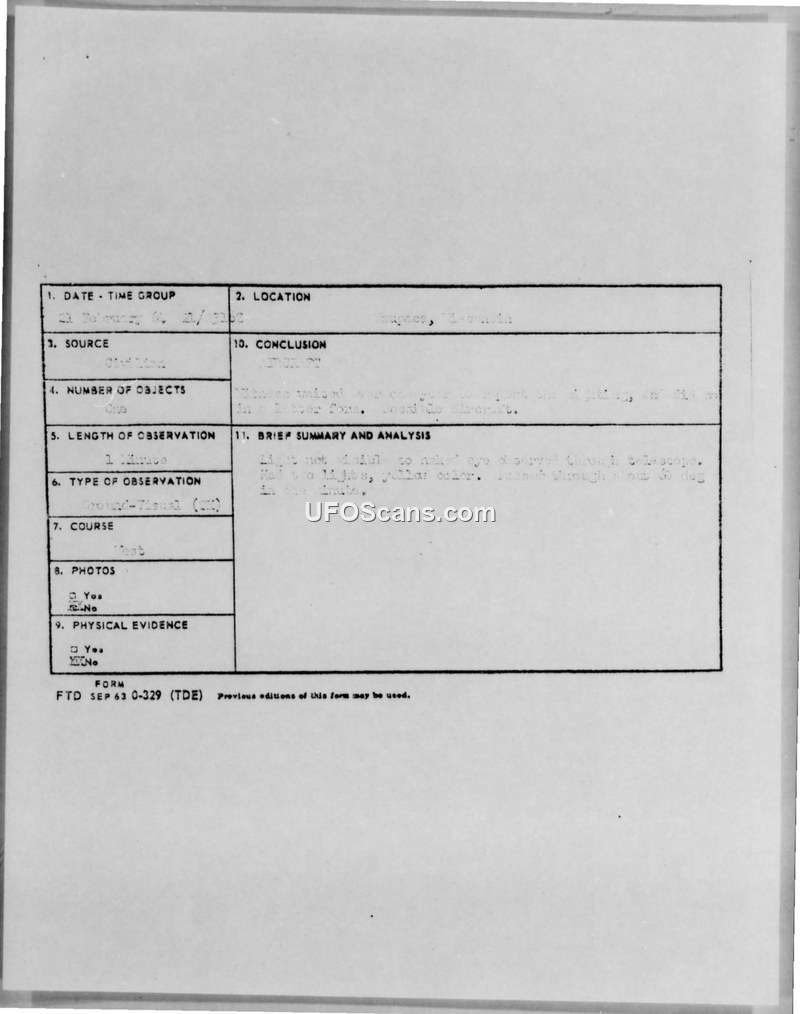 UFO Sighting Report — Waupaca, Wisconsin, February 21, 1964