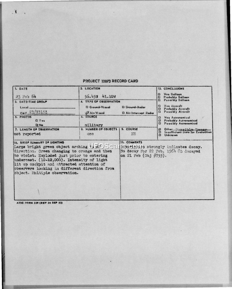The sighting was attributed to the decay of an object (Obj #755) that had occurred on 21 February 1964.