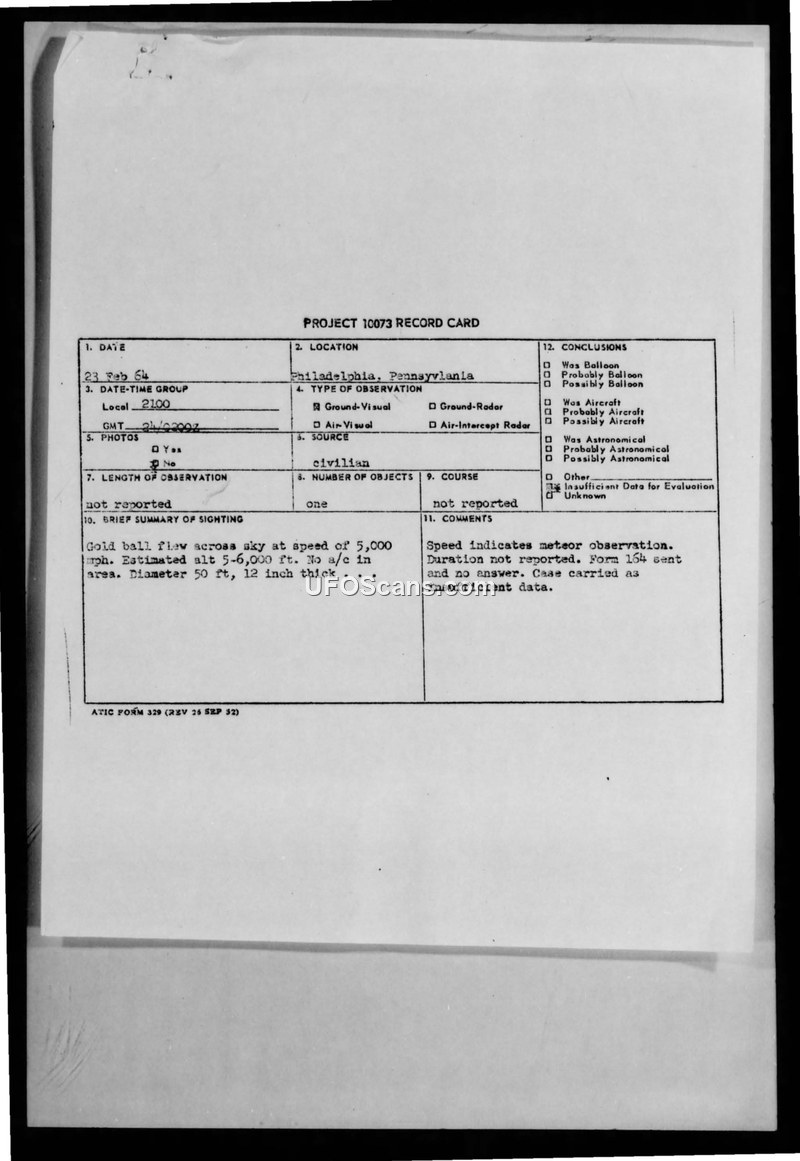 This document collection consists of a series of letters and record cards documenting a persistent correspondence between a civilian, Joseph Marinelli of Philadelphia, and the United States Air Force regarding Unidentified Flying Objects (UFOs). The primary record card, dated February 23, 1964, details a sighting by Marinelli of a 'gold ball' object, approximately 50 feet in diameter and 12 inches thick, which he observed flying at 5,000 mph at an altitude of 5,000-6,000 feet. The Air Force concluded this was likely a meteor observation, though the case was ultimately filed as 'insufficient data.' The remainder of the document comprises numerous letters from Marinelli to the Department of Defense and the Air Force, spanning from 1962 to 1964. In these letters, Marinelli poses a wide array of questions regarding UFO phenomena, government secrecy, the 'men in black,' the Roswell incident (referred to as the 'New Mexico Disc'), and various other historical UFO-related claims. The Air Force responses, notably from Major Maston M. Jacks and Colonel C. R. Carlson, consistently maintain that the Air Force has no evidence of a threat to national security, no evidence of extraterrestrial vehicles, and that they lack the clerical staff to engage in prolonged discussions with non-scientific researchers. The correspondence reflects a significant tension between the civilian's intense desire for disclosure and the military's standard operating procedure of dismissing or redirecting such inquiries toward published literature, such as the book 'The World of Flying Saucers' by Menzel and Boyd.
