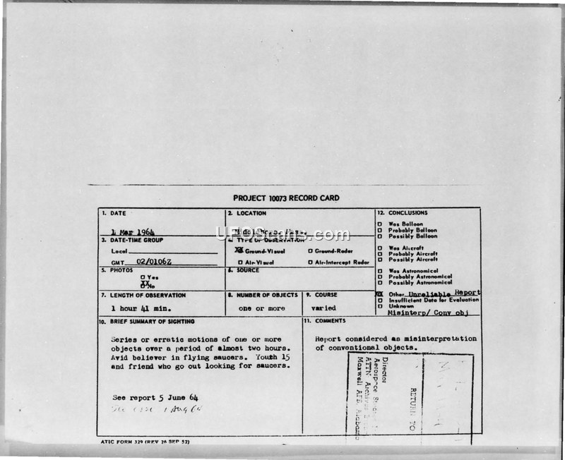 The sighting of 1 March 1964 was evaluated as a misinterpretation of conventional objects. The 5 June 1964 sighting was likely meteors.