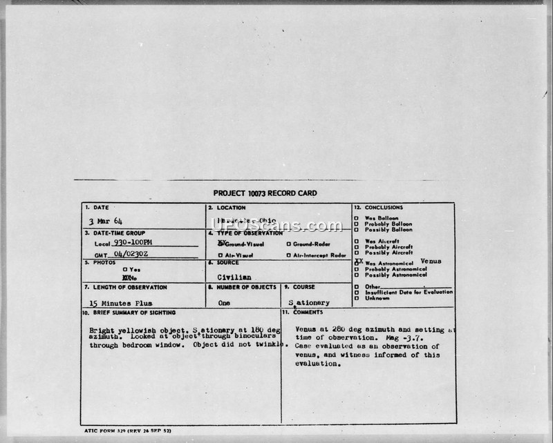 Project 10073 Record Card — Marietta, Ohio, 3 March 1964
