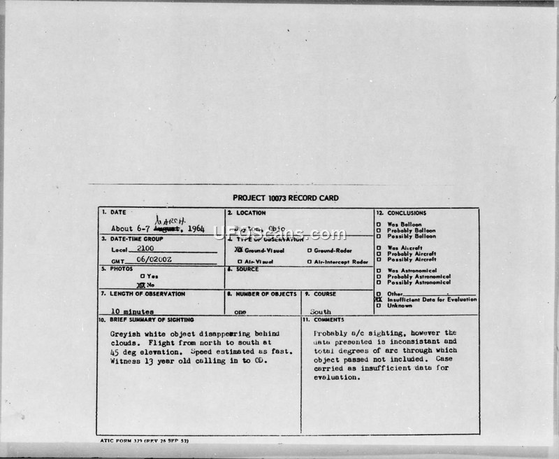 A 13-year-old witness in Dayton, Ohio, reported a fast-moving greyish-white object in March 1964. The Air Force concluded the case as having insufficient data for evaluation.
