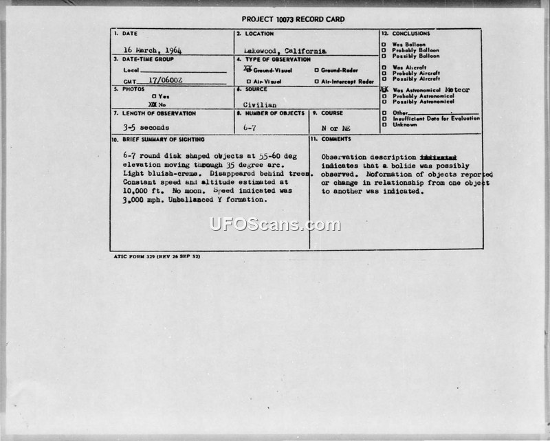 On March 17, 1964, at 0600Z, an individual residing on Lakewood Heights Drive in Lakewood, Colorado, reported a sighting of unidentified aerial phenomena. The witness, identified as an ex-Navy pilot and Assistant Base Operations Officer at Lowry Air Force Base, observed 6 to 7 round, bluish-creme objects moving through a 35-degree arc. The objects were described as maintaining a constant speed of 3,000 mph at an estimated altitude of 10,000 feet, arranged in an unbalanced Y formation that was stacked downward. The observation lasted between 3 and 5 seconds before the objects disappeared behind trees in the observer's backyard. The weather was reported as clear and cold with no clouds. The official Air Force evaluation, documented on a Project 10073 record card and via staff message, concluded that the description provided by the witness indicated the objects were possibly a bolide. The report notes that no change in the relationship between the objects was observed during the brief encounter.