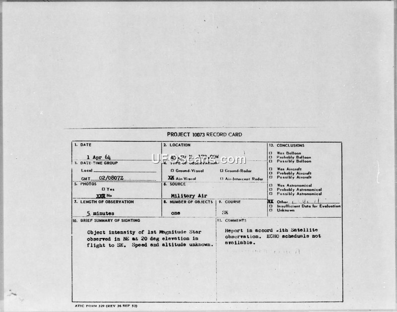 PROJECT 10073 RECORD CARD - 1 APR 64