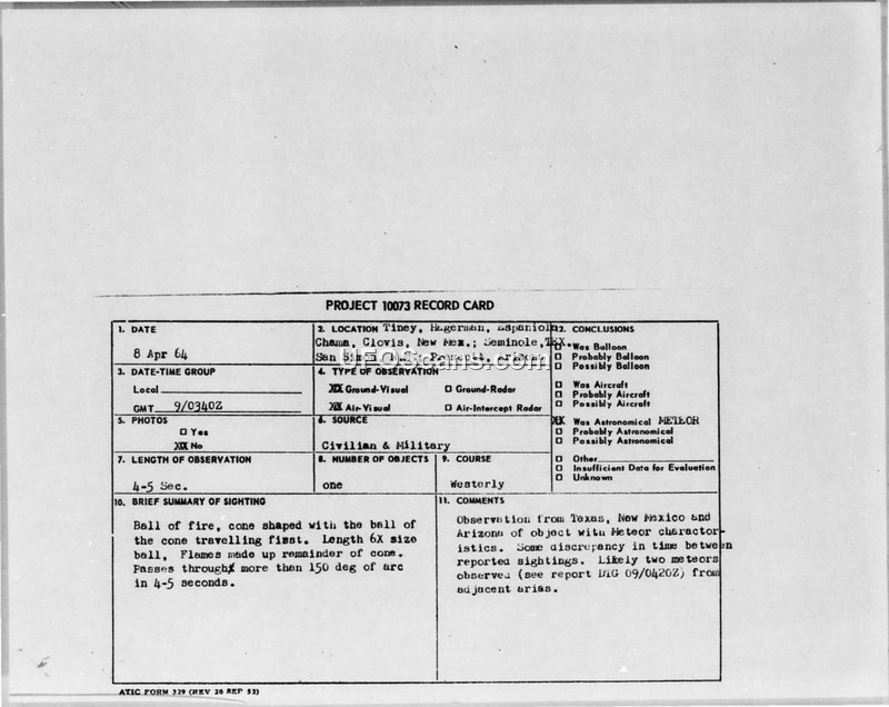 A series of reports from 9 April 1964 across the Southwestern United States described a 'ball of fire' with a cone-shaped tail. The Air Force concluded the sightings were likely meteors.