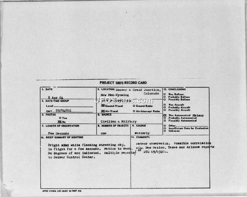 A bright, flashing object observed over Colorado and surrounding states on 8 April 1964 was reported to the Air Force. The incident was officially classified as a meteor observation.