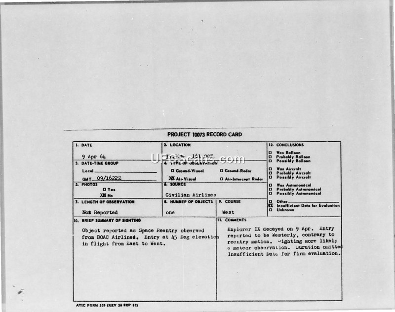 On April 9, 1964, at 1622Z, a BOAC Airlines flight reported observing a space vehicle re-entry at coordinates 35.50N 161.00E. The object was described as moving from East to West at a 45-degree angle of elevation. The report noted that the object appeared to split apart upon re-entry. The incident was documented under Project 10073 and processed via a CIIRVIS report. Subsequent analysis by the Air Technical Intelligence Center (ATIC) suggested that the sighting was likely a meteor observation. The conclusion was based on the fact that the reported westerly trajectory was inconsistent with the known decay and reentry motion of the Explorer IX satellite, which had also decayed on April 9. Due to the lack of duration data and the conflicting trajectory, the official assessment concluded there was insufficient data for a firm evaluation.