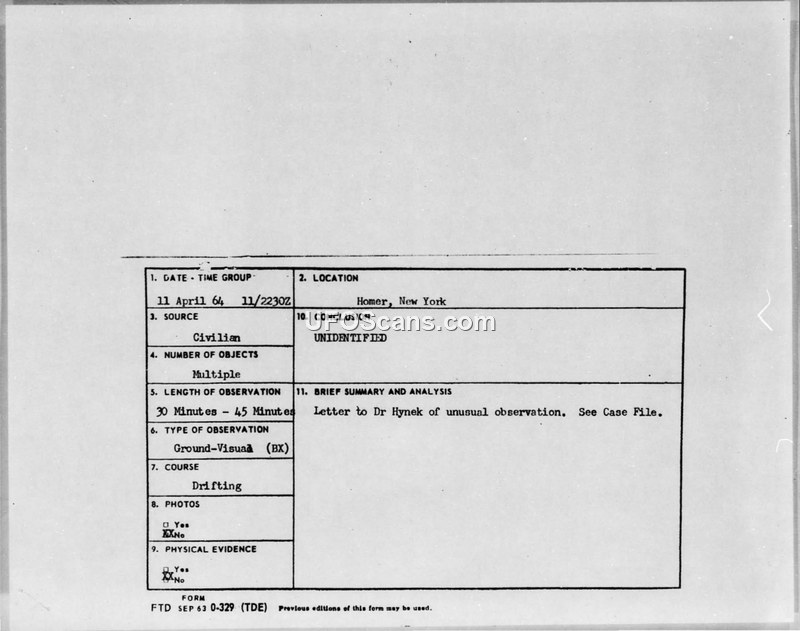 A former WWII pilot reported observing multiple unidentified objects over Homer, New York, on April 11, 1964. The case was investigated by Dr. J. Allen Hynek, who found the witness credible and the phenomena unexplained.