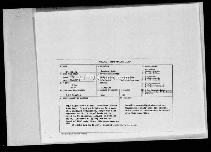 Project 10073 Record Card — Dayton, Ohio, 19 April 1964