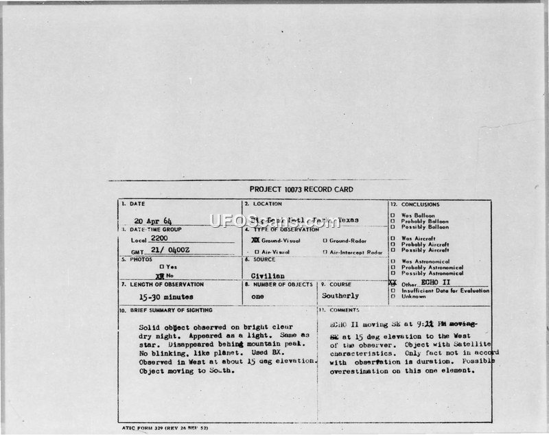 A civilian reported a star-like object in Big Bend National Park on April 20, 1964. The U.S. Air Force identified the object as the ECHO II satellite.