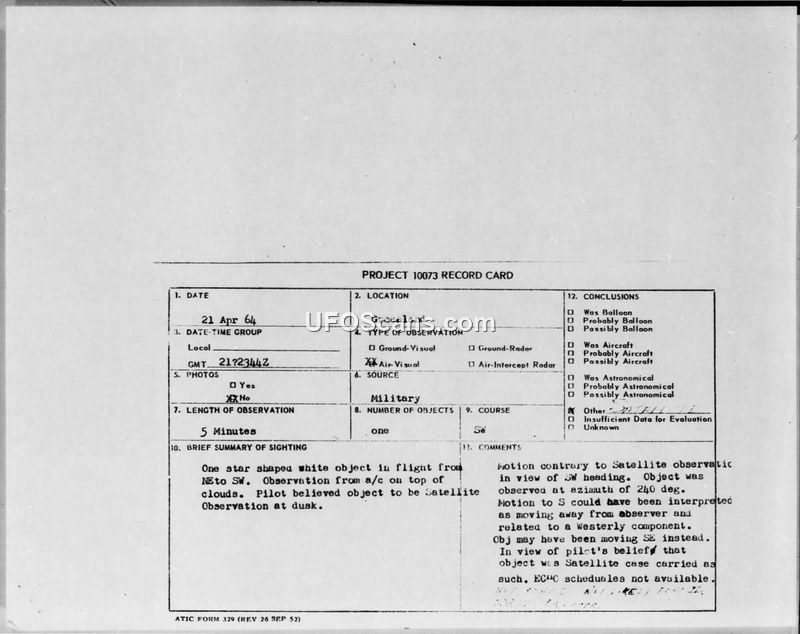 PROJECT 10073 RECORD CARD — Sighting Report 21 April 1964