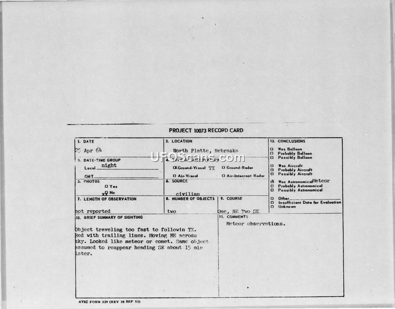 PROJECT 10073 RECORD CARD — North Platte, Nebraska, 25 April 1964
