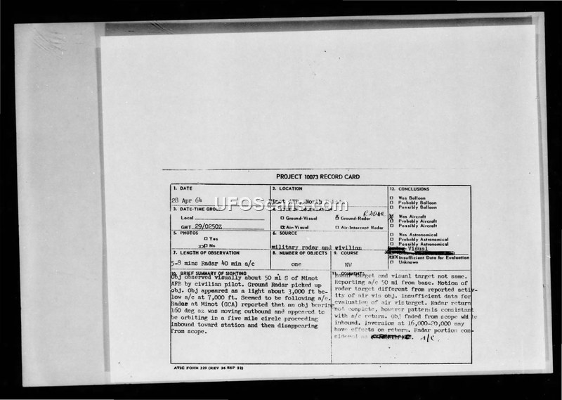 Project 10073 Record Card: Minot AFB Sighting, 29 April 1964