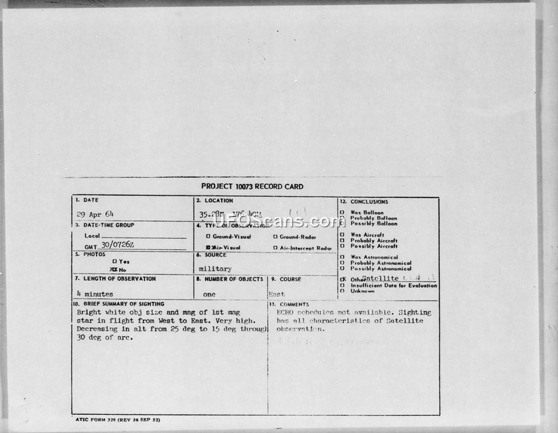 Project 10073 Record Card and CIRVIS Report — 29 April 1964