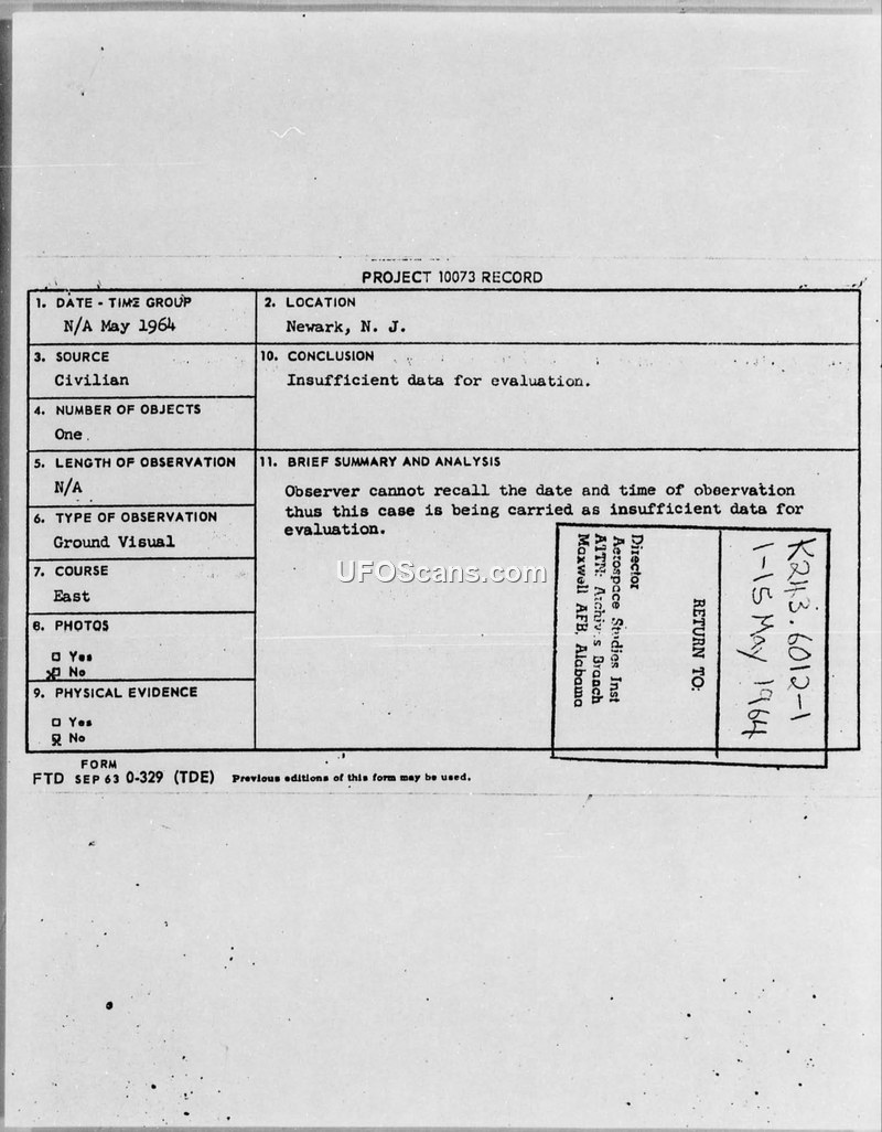Project 10073 Record — Newark, N.J. Sighting, May 1964