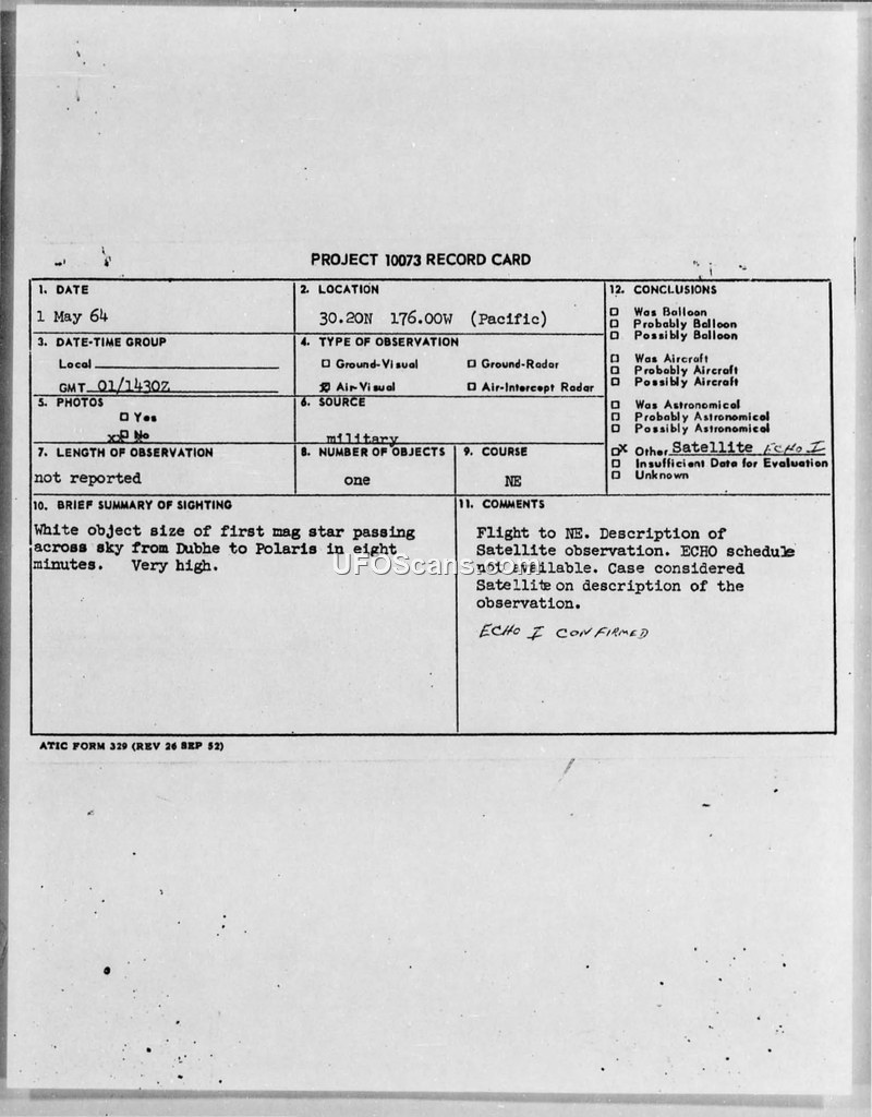 On May 1, 1964, a CIRVIS report (V143189) was filed regarding a white object observed in the Pacific at coordinates 30.20N 176.00W. The object, described as having the size of a first-magnitude star, was observed at 011430Z. It was reported to be at a very high altitude and traveled along a course connecting the stars Dubhe and Polaris, passing through the Big Dipper over a duration of eight minutes. The sighting was reported by the 326th Air Division at the Kunia Facility. Following an evaluation, the object was identified as the Echo I satellite. The report notes that the Echo schedule was not available at the time, but the description of the observation led to the conclusion that it was indeed the satellite.