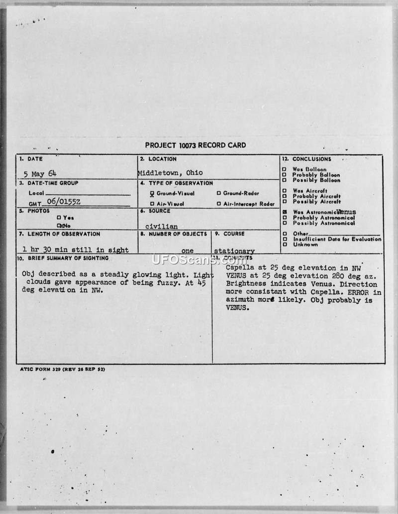 Project 10073 Record Card — Middletown, Ohio, 5 May 1964