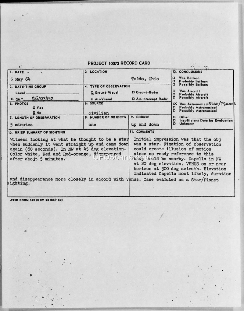 Project 10073 Record Card — Toledo, Ohio, 5 May 1964