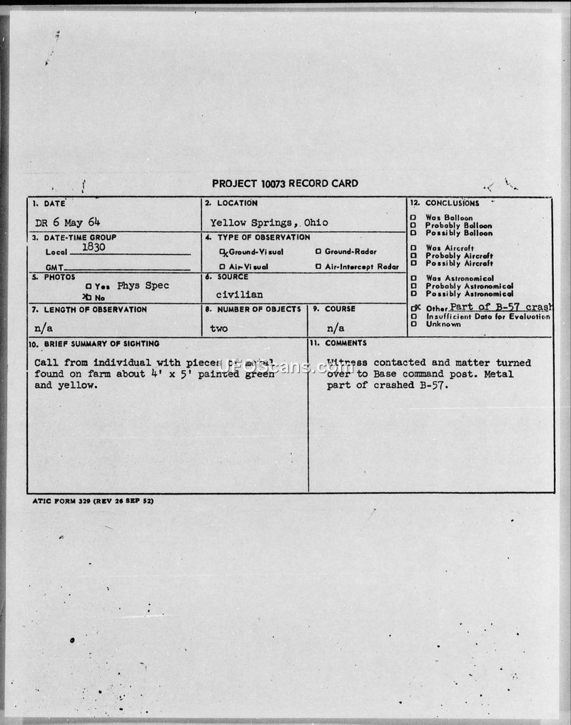 On May 6, 1964, at 1830 hours, a civilian in Yellow Springs, Ohio, reported finding two pieces of metal on her farm. The objects were described as being approximately 4 feet by 5 feet, painted green and yellow, and made of aluminum. The report was initially handled by Captain Hartke, the Duty Officer, who received the call and subsequently coordinated with the ASD Command Post. The matter was then transferred to the Base Command Post. It was determined that the metal pieces were debris from a crashed B-57 aircraft. The documentation consists of a Project 10073 Record Card and an extract from the Duty Officer's report signed by 1st Lt. Robert A. Callanan of the Foreign Technology Division.