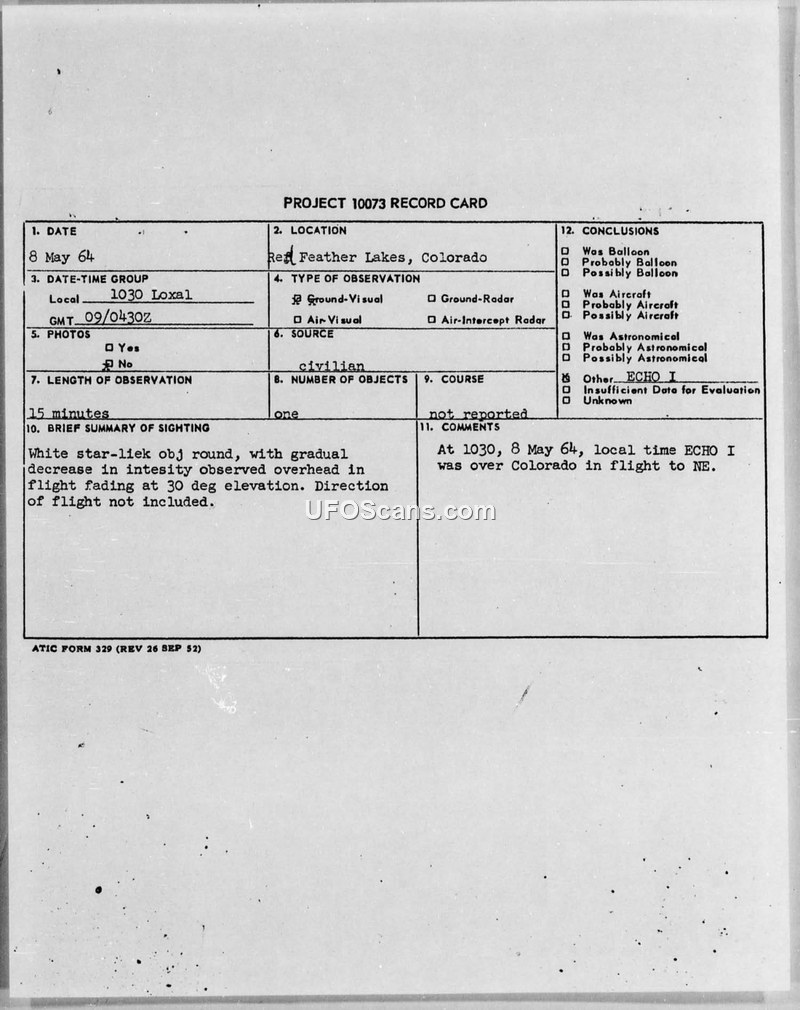 PROJECT 10073 RECORD CARD: Sighting at Red Feather Lakes, Colorado, 8 May 1964